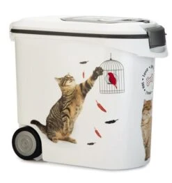De container bevat een klepje aan de bovenkant, zodat je de brokjes gemakkelijk in een kattenvoerbak kunt schenken. Voorzien van een handvat en wieltjes, zodat je de voedselcontainer gemakkelijk kunt verplaatsen. Leuk detail: voorzien van diverse kattenprints.