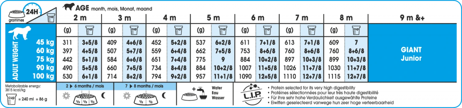 ROYAL CANIN® Giant Puppy is geschikt voor pups van zeer grote rassen, tussen de 2 en 8 maanden oud, met een volwassen gewicht van 45 kilogram of meer. De juiste voedingsstoffen helpen bij de ondersteuning van het hoge groeitempo tijdens deze belangrijke eerste groeifase.