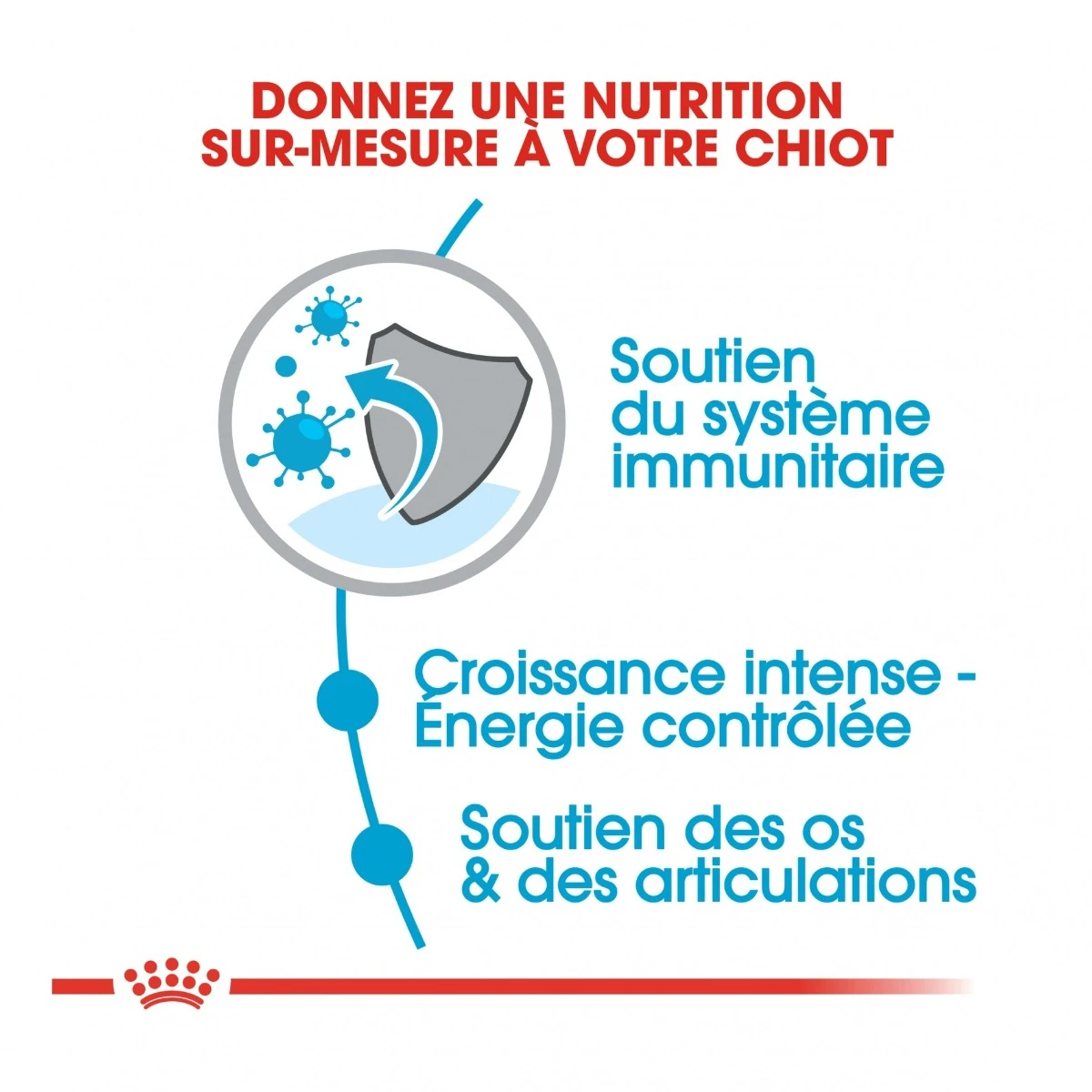 ROYAL CANIN® Giant Puppy draagt bij aan een goede mineralisatie van de botten van een pup van een zeer groot ras, dankzij een evenwichtige inname van energie en mineralen zoals calcium en fosfor.