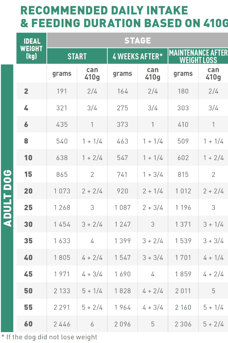 Speciale dieetvoeding voor als je hond te zwaar is. Beschikbaar in 12 x 195g en 12 x 410g.